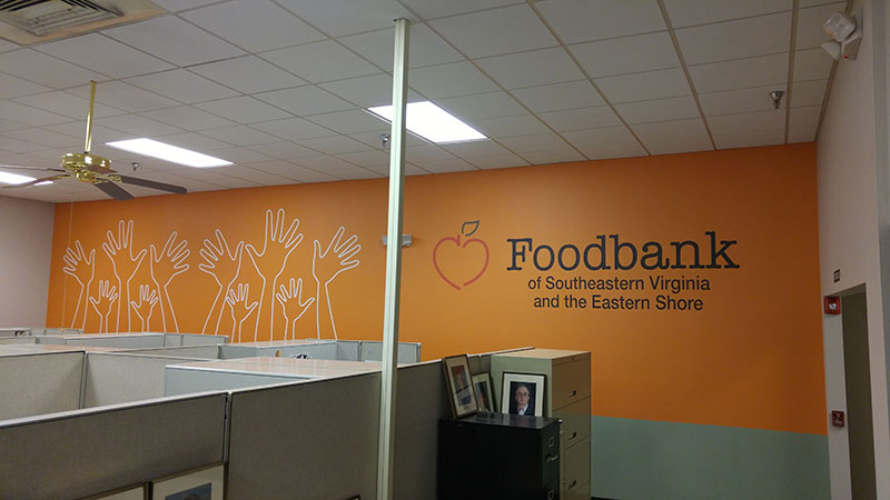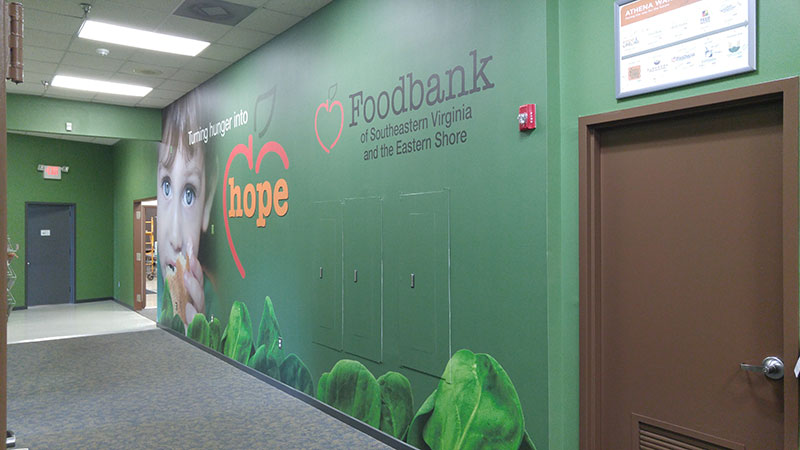 Foodbank of Southeast Virginia and the Eastern Shore on their wallpaper project. The project included 35 walls each one with a unique design. The total amount of material printed was nearly 10,000 square feet! Dreamscapes canvas was used as a custom wallpaper graphic.