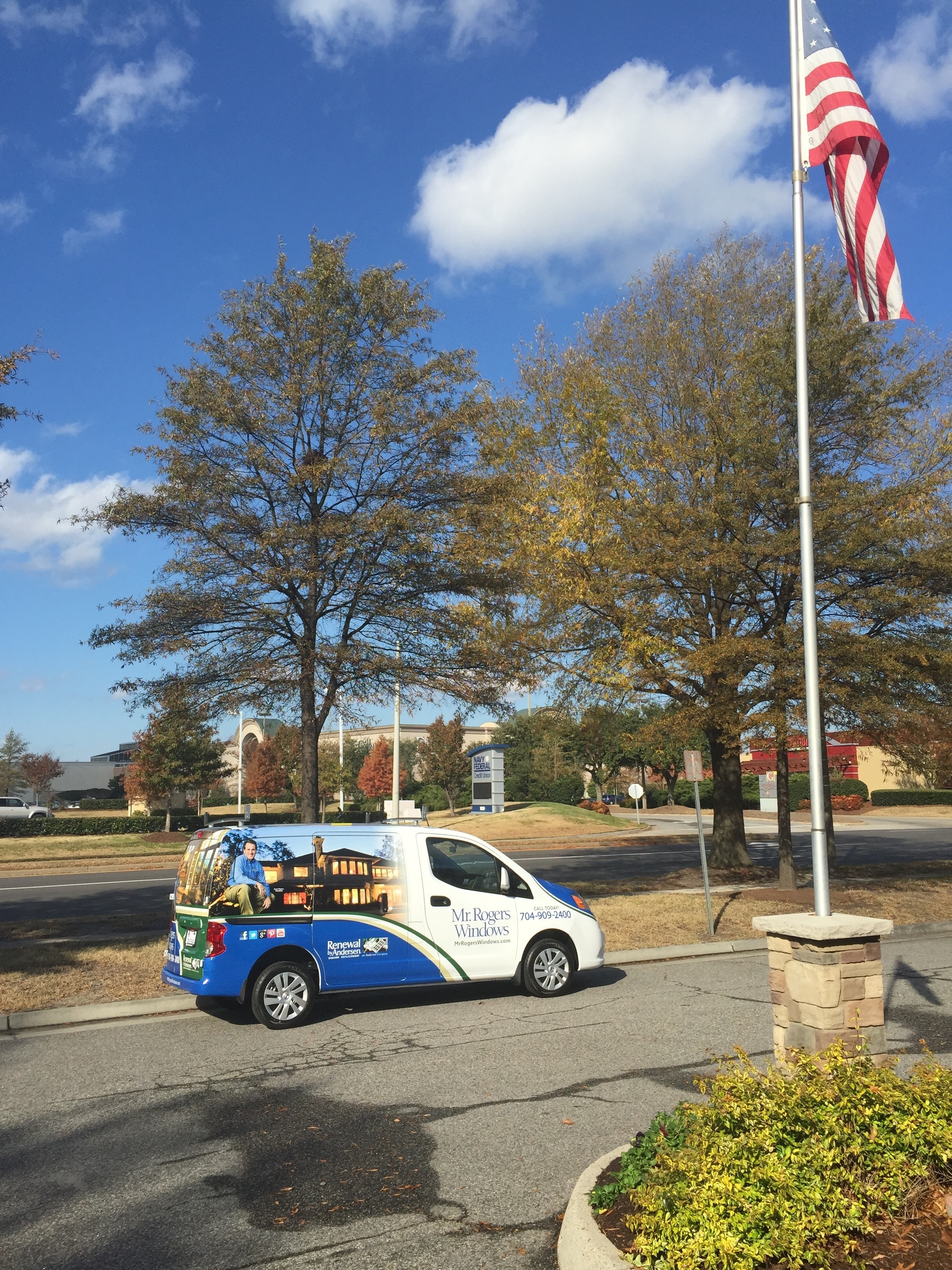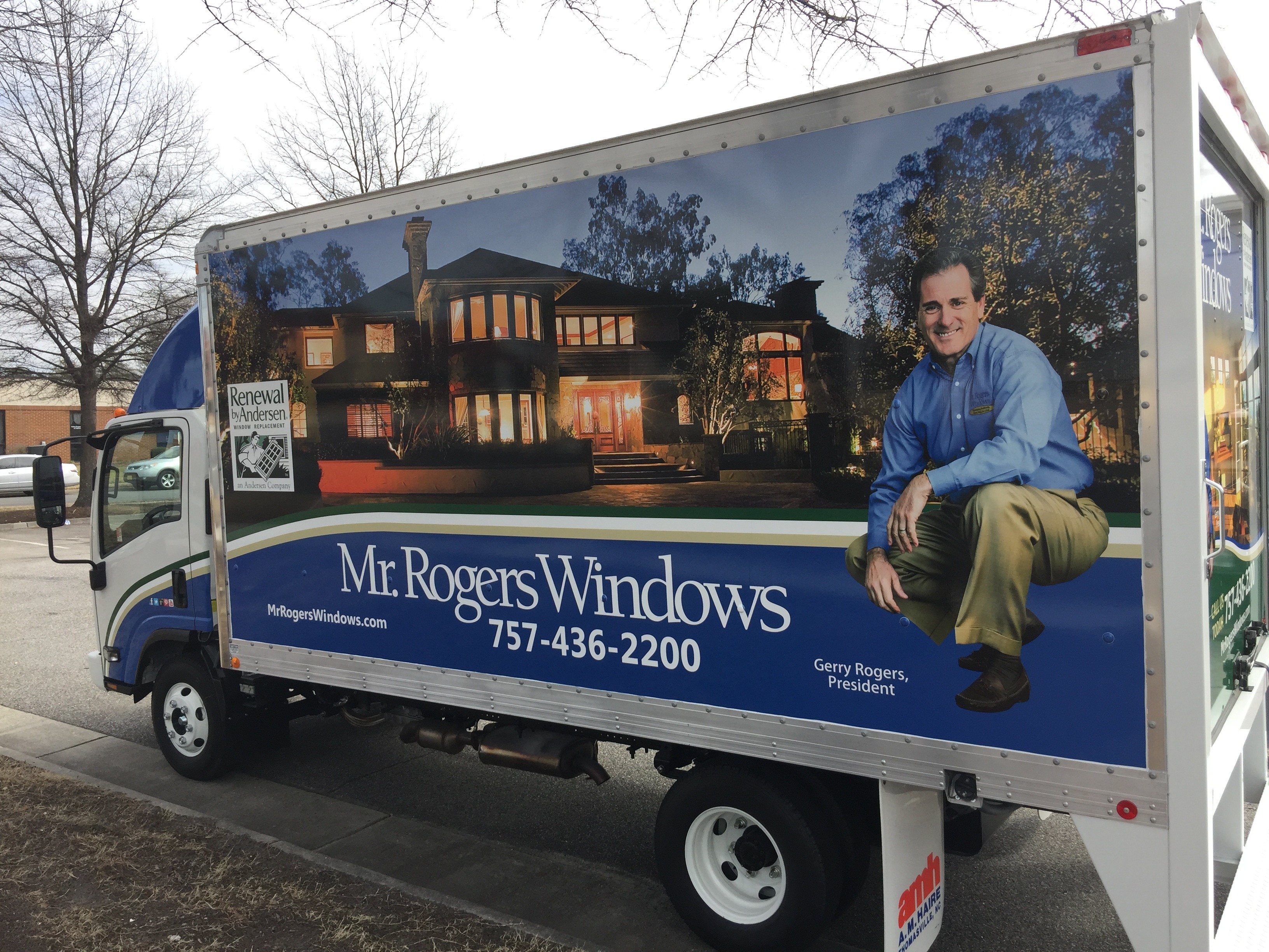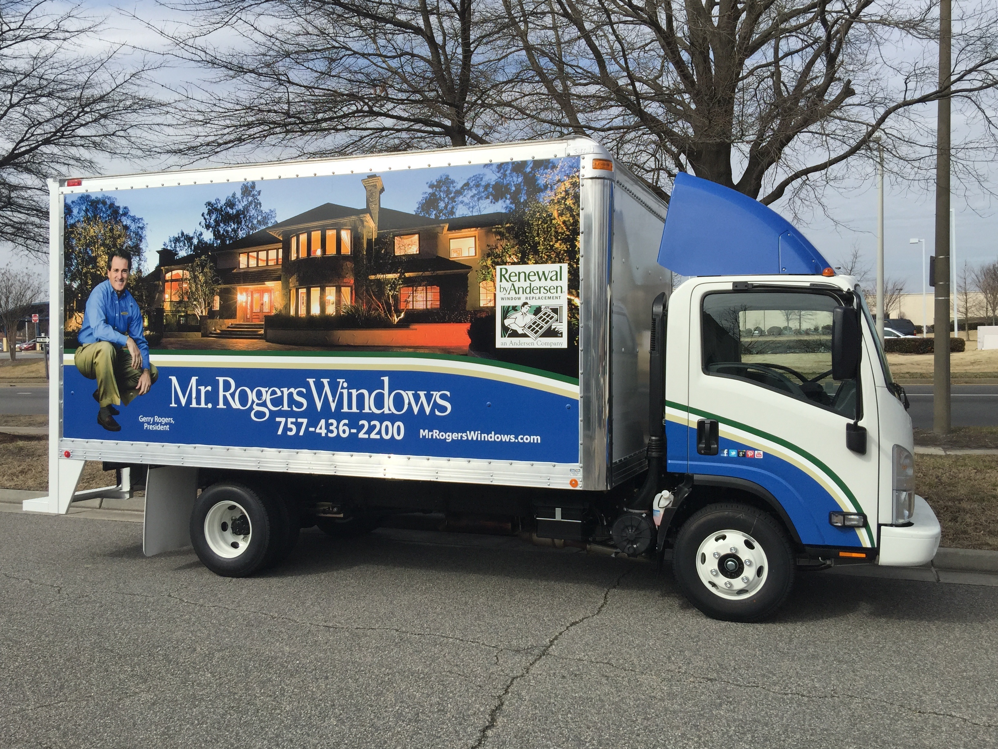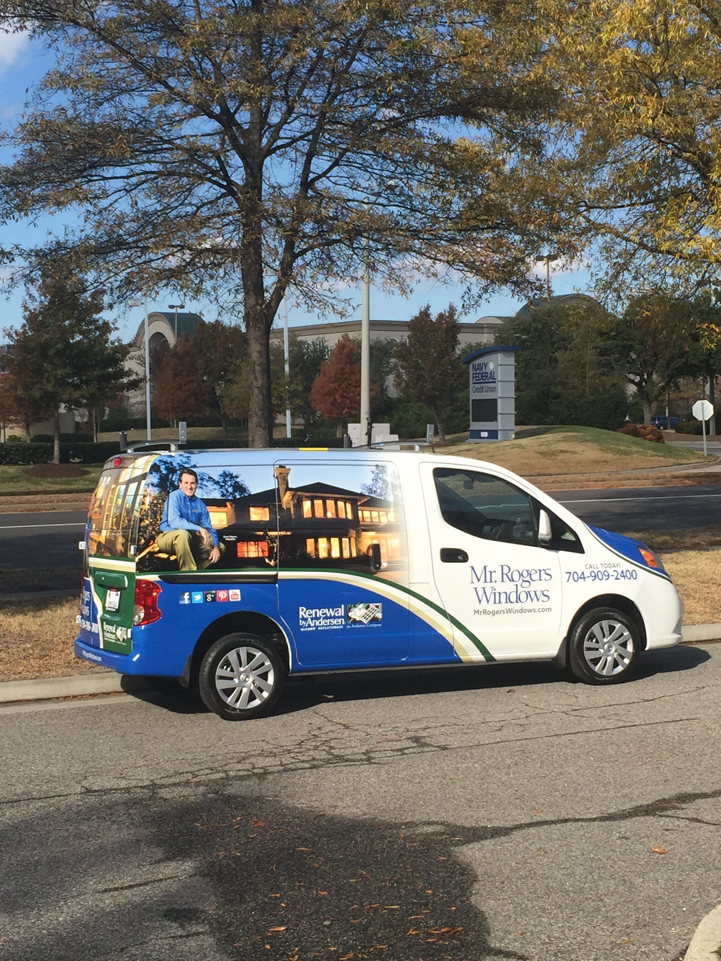 The original design concept was provided by the Mr. Rogers Windows marketing contact, Terry Finder of the Terry Group.The team loves the house picture that is seen in the wrap design. The house picture is used in everything from newspaper ads to flyers. Our graphic designer Marc Reyes worked diligently for months with Terry and Gerry to refine the design layout so that it fit the fleet of new vans and box trucks that Gerry purchased at the end of last year.