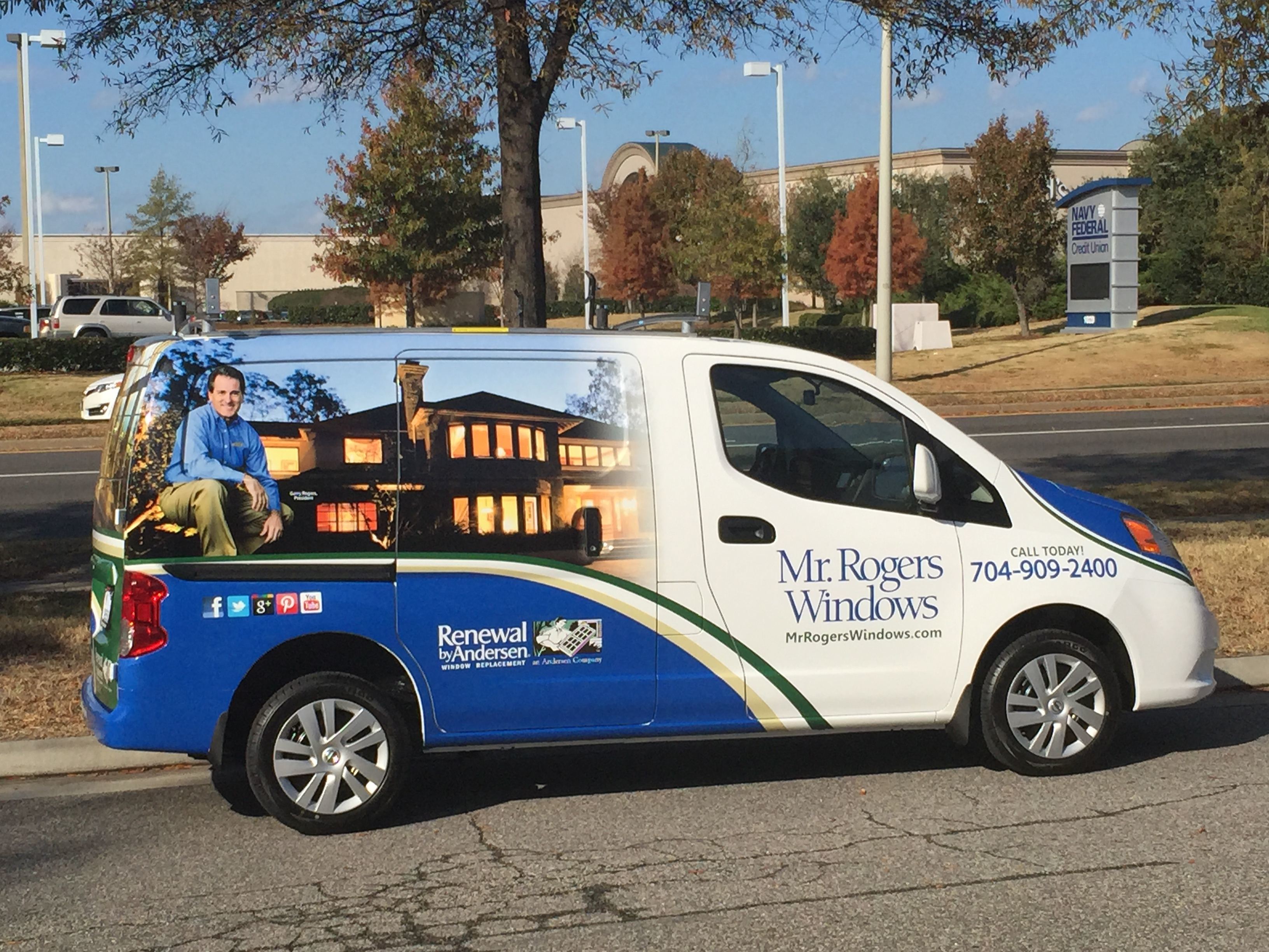 The Graphics Shop has  worked with Mr. Rogers Windows for over a year to come up with the right solution for them. We teamed up with their marketing firm, The Terry Group, that handles everything from business cards and brochures to TV commercials. It took some time to get the wrap project going as the recession cut into their advertising budget. At the time Gerry Rogers felt like the advertising they were doing with TV and radio was sufficient. After the budgetary concerns were taken care of the project was able to be completed.